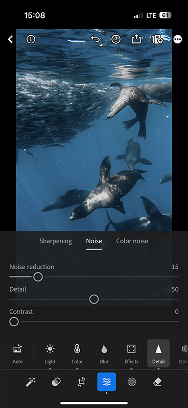 - Detail → Noise Reduction: 15–40 if the shot has backscatter/particles